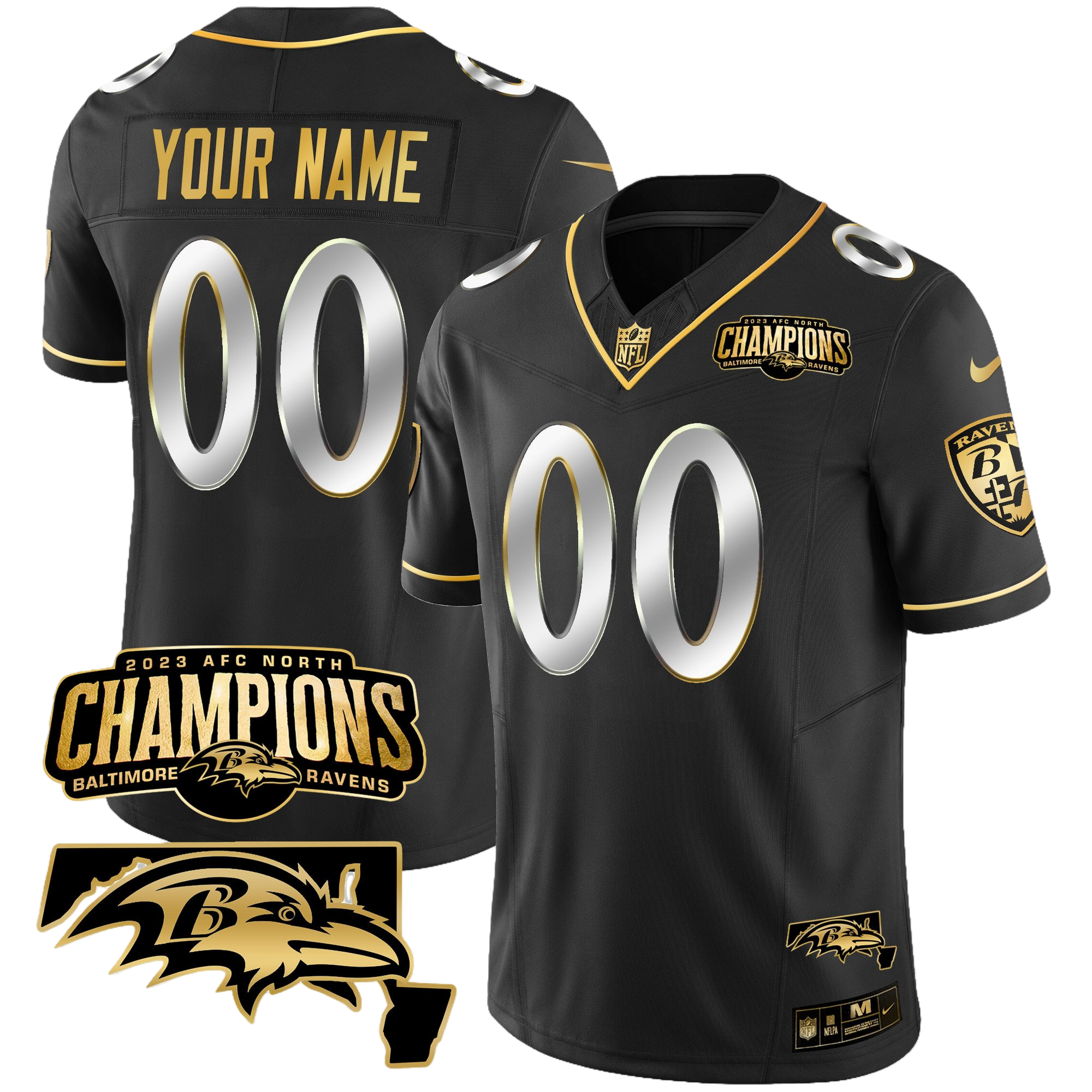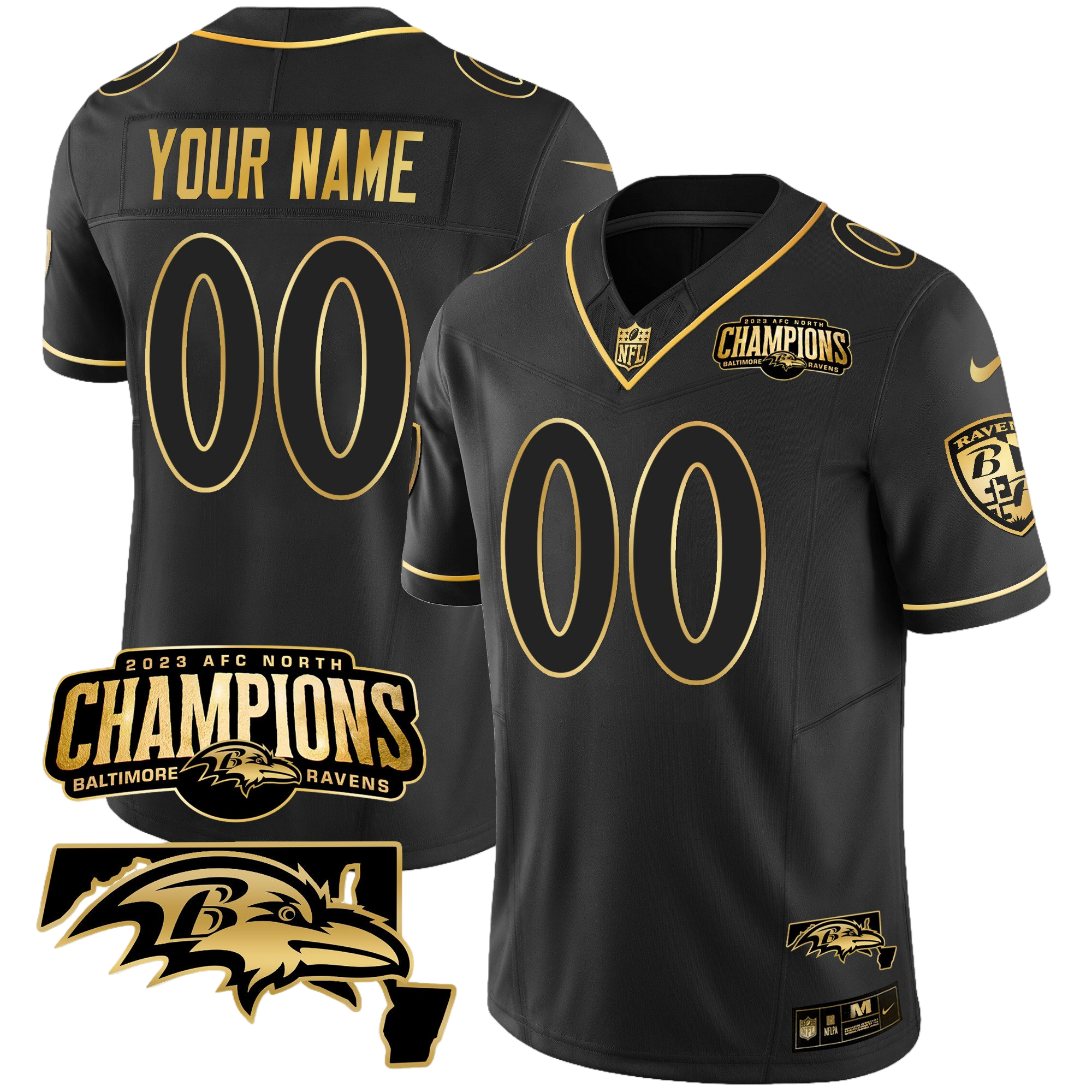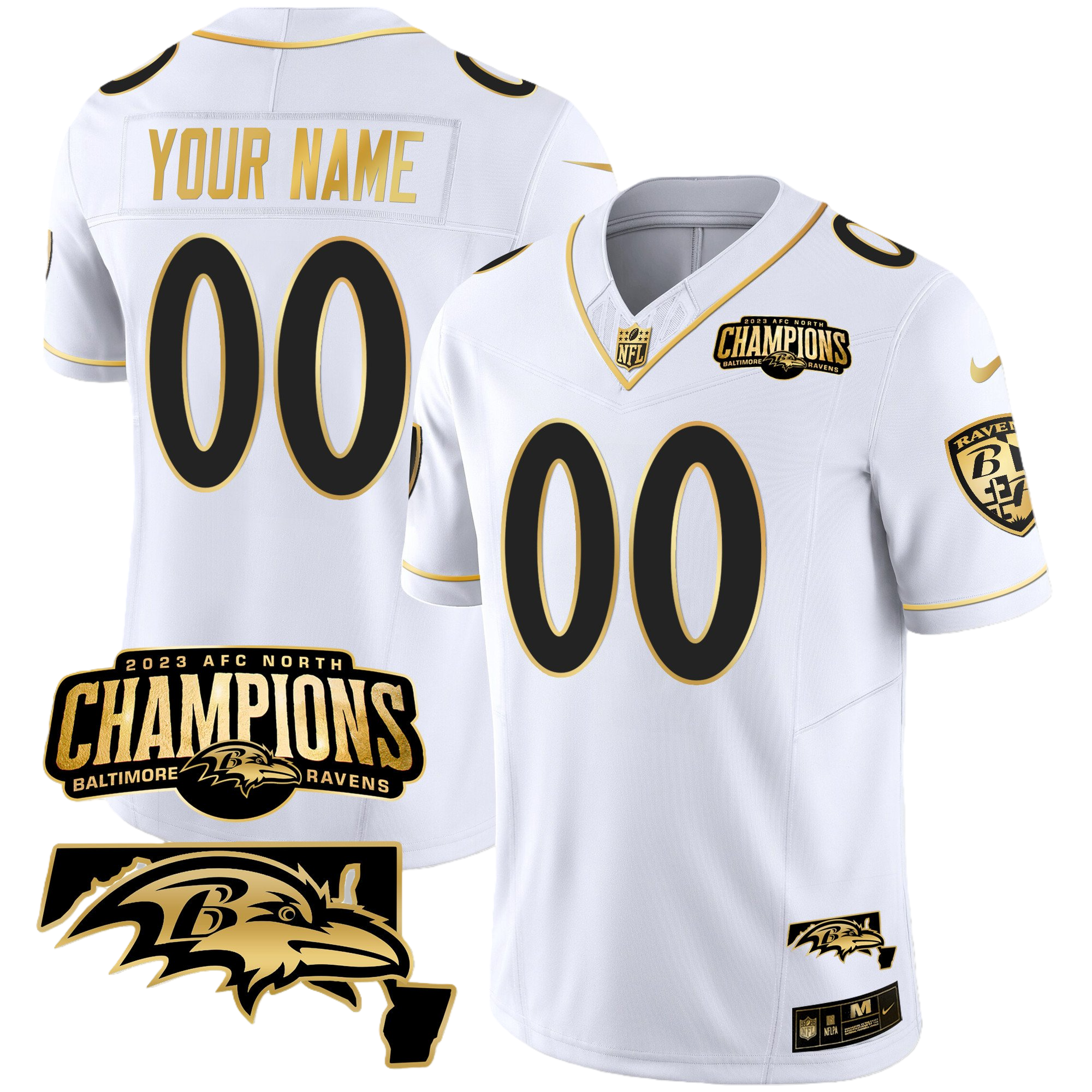 Baltimore Ravens 2023 AFC North Champions & Maryland Patch Gold Vapor Custom Jersey – All Stitched 3
