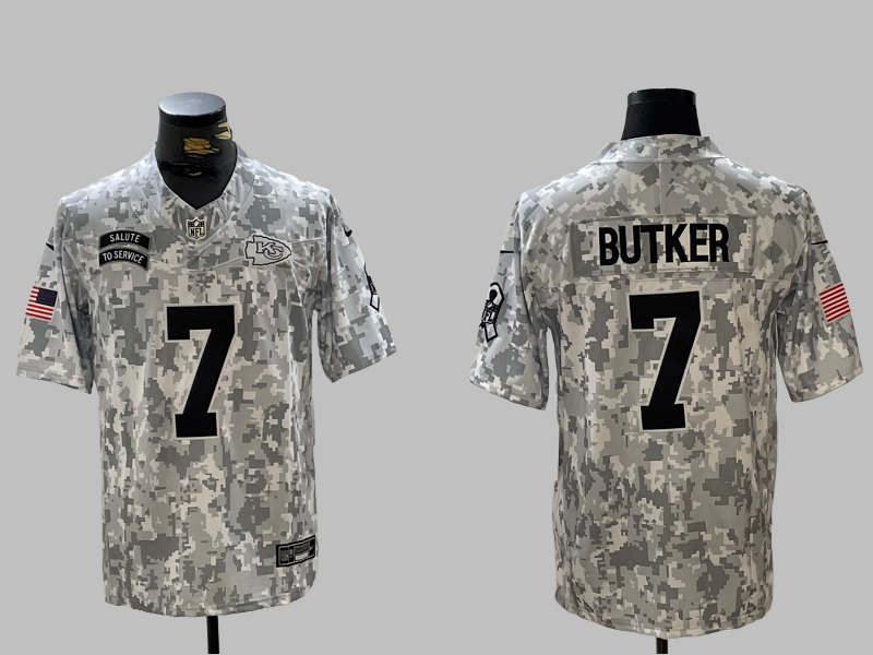 Men's Kansas City Chiefs #7 Harrison Butker Stitched Camo Salute To Service Limited NFL Jersey