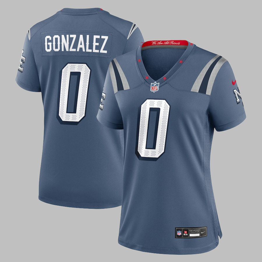 Women's New England Patriots #0 Christian Gonzalez All Stitched NFL Storm Blue 2025 Rivalries Collection Jersey