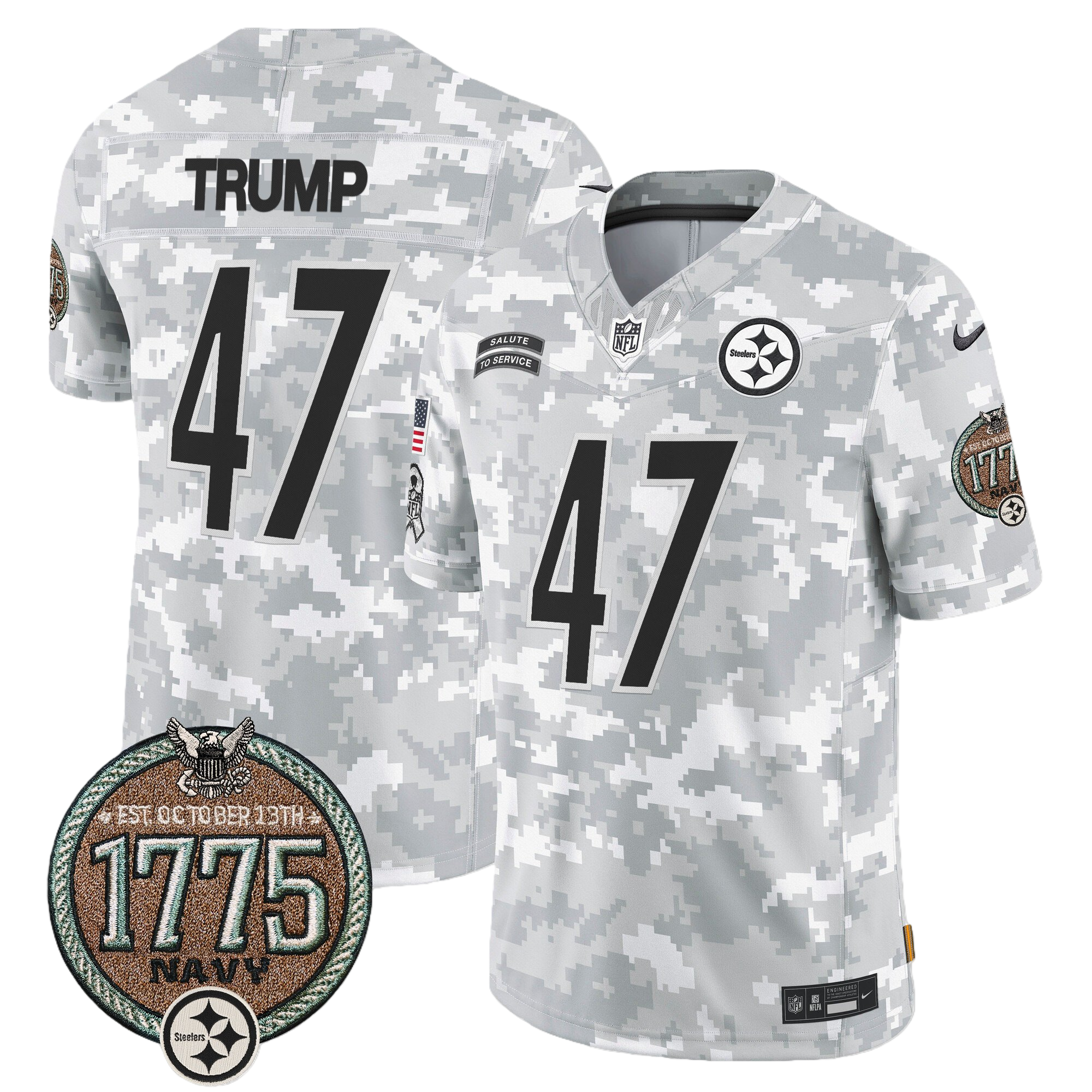Pittsburgh Steelers 2024 Salute to Service Establishment Year Patch Vapor Limited Jersey – All Stitched 28- #47 Donald Trump