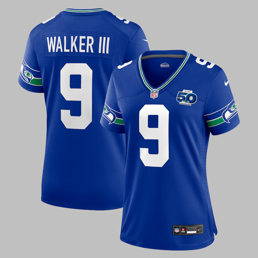 Women's Seattle Seahawks #9 Kenneth Walker III All Stitched NFL Royal 50th Season Throwback Jersey