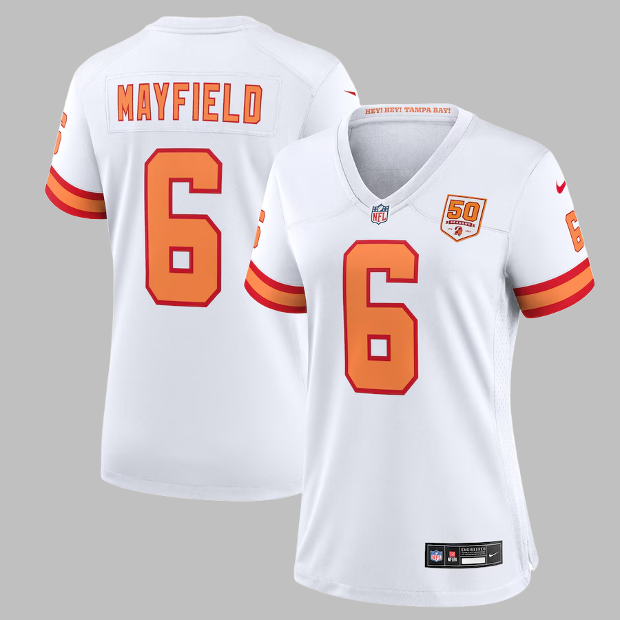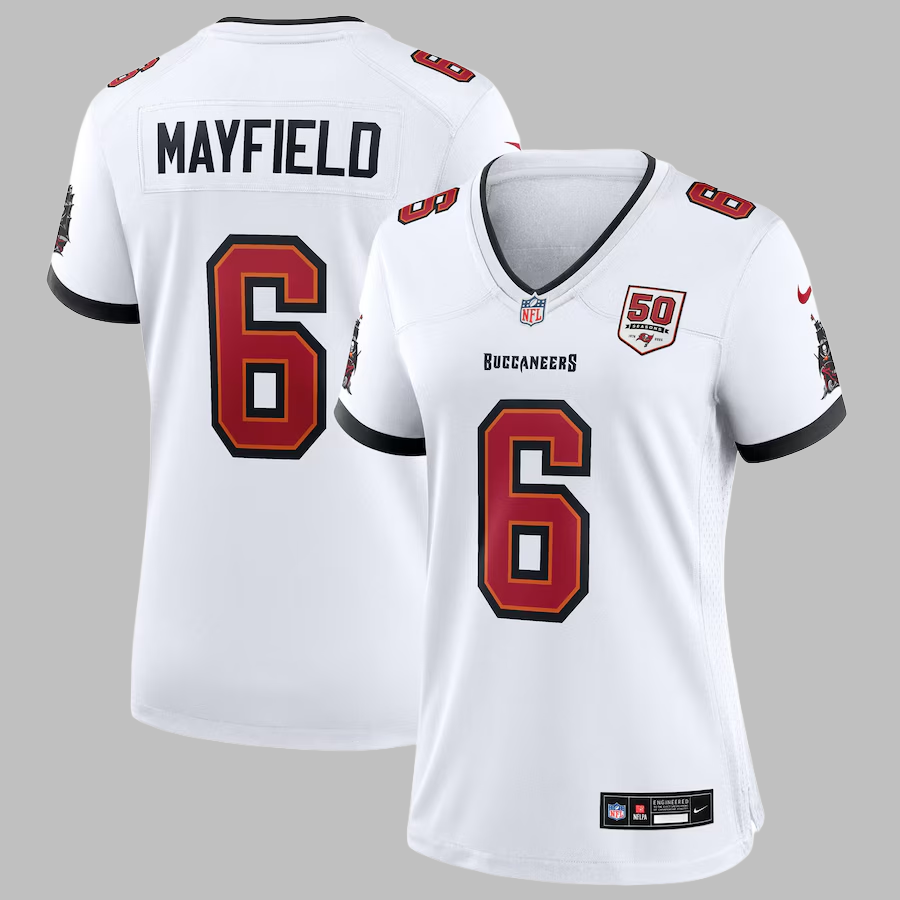 Women's Tampa Bay Buccaneers #6 Baker Mayfield All Stitched NFL White 50th Season Jersey